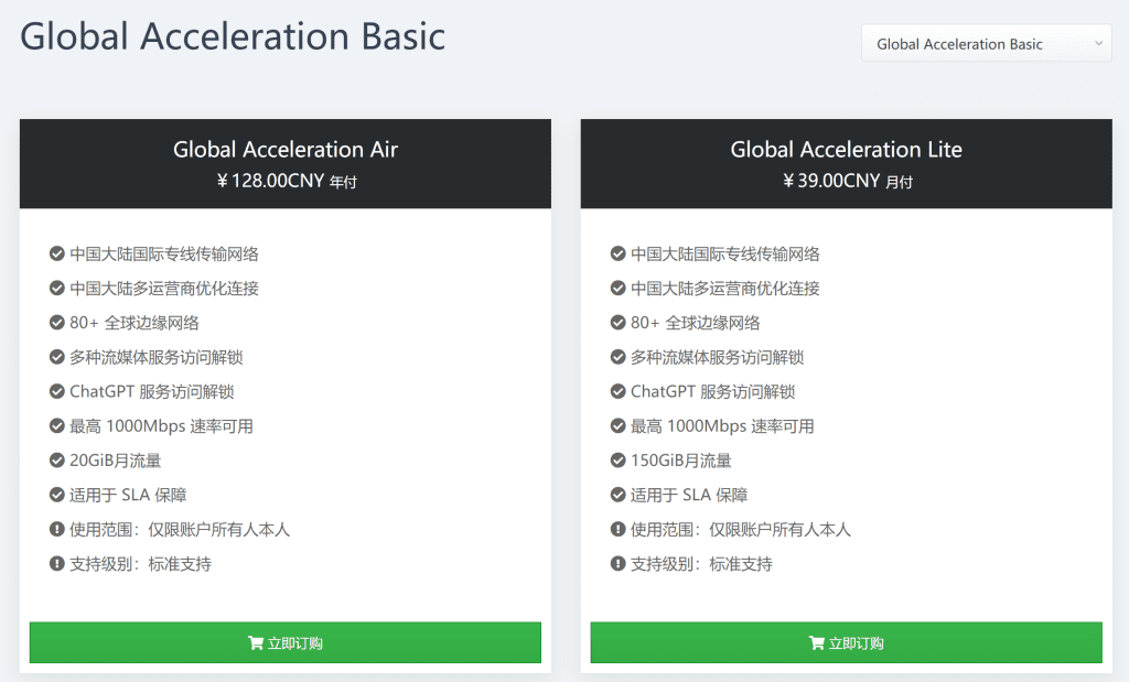 - Global Acceleration Lite (月付/年付): 如果你只是偶尔查查资料,刷刷推特,对视频需求不大,这个入门套餐完全够用,性价比很高。