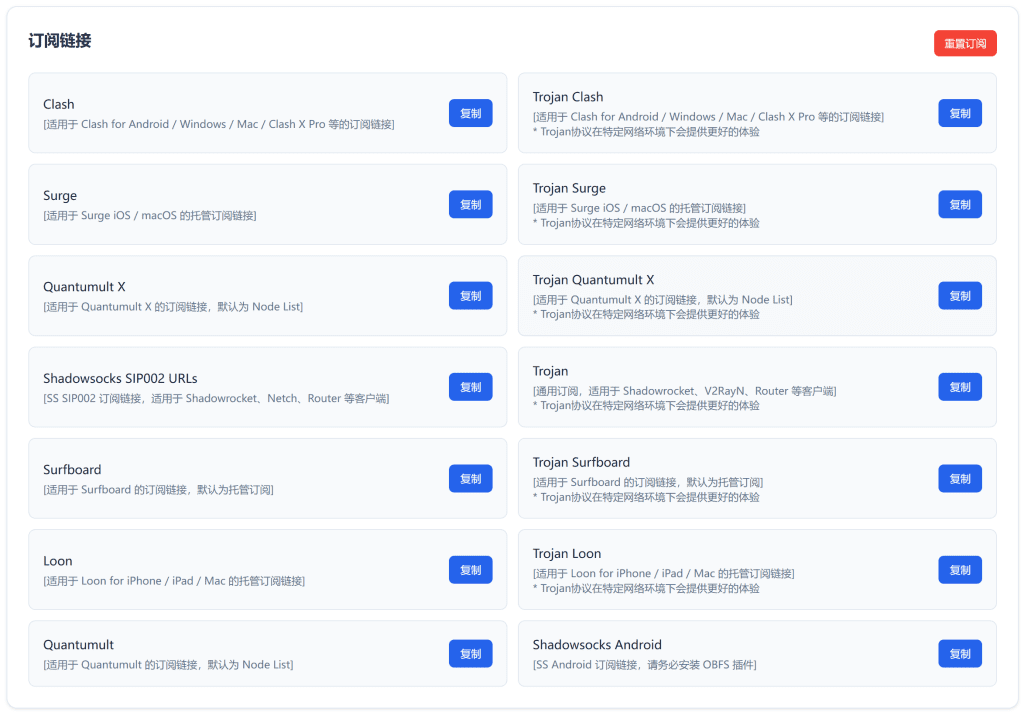 你不需要去研究那些复杂的协议(比如SS-AEAD, Trojan),后台都给你配置好了,你只管复制粘贴就行。